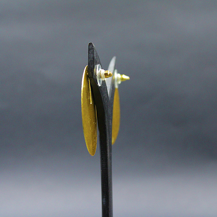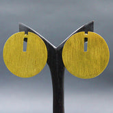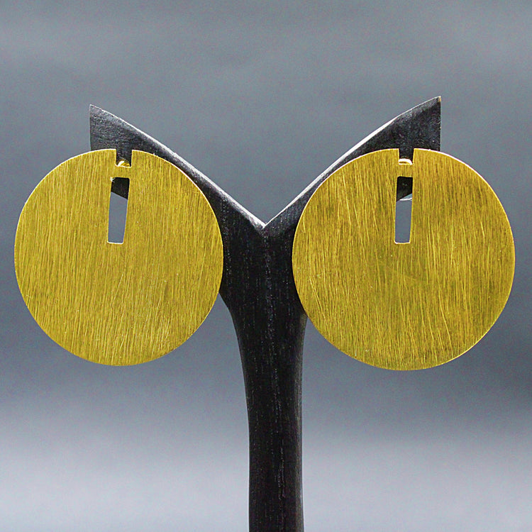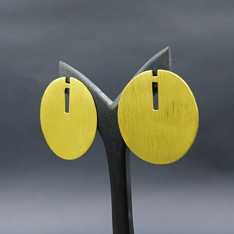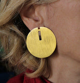 Pendientes DISK, aportan mucha luminosidad al rostro gracias a su diseño. Presentan un diseño original y llamativo. Cada pendiente está cuidadosamente elaborado a mano y bañado en oro 18 kt, lo que le otorga un toque de lujo. Hechos en latón, bañados en oro, sin níquel. Hipoalergénicos.