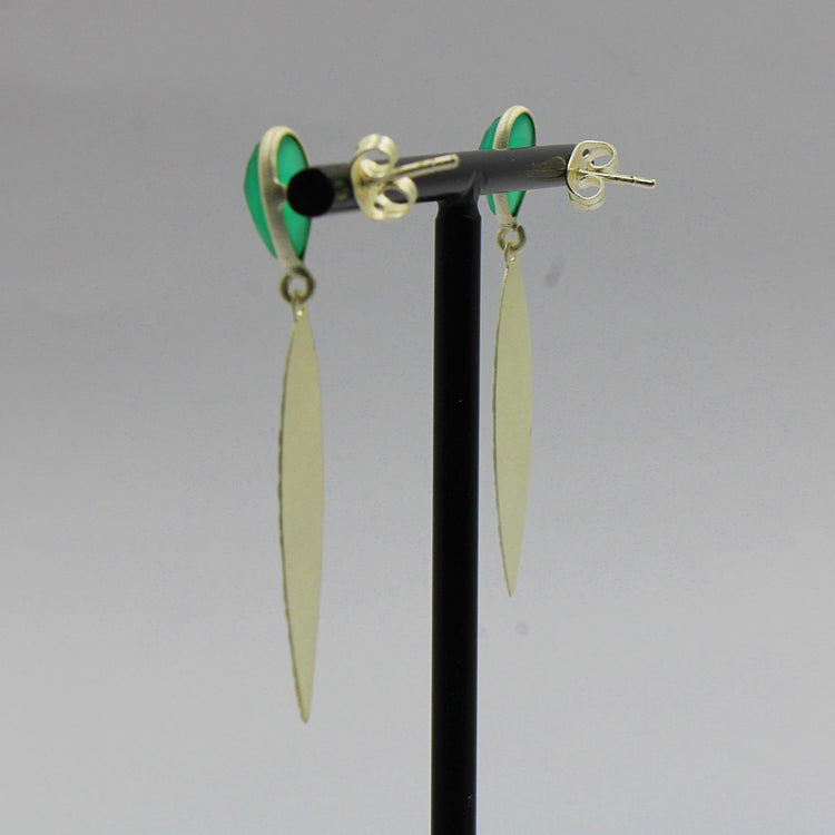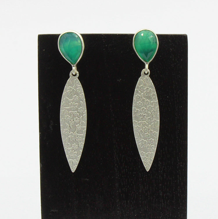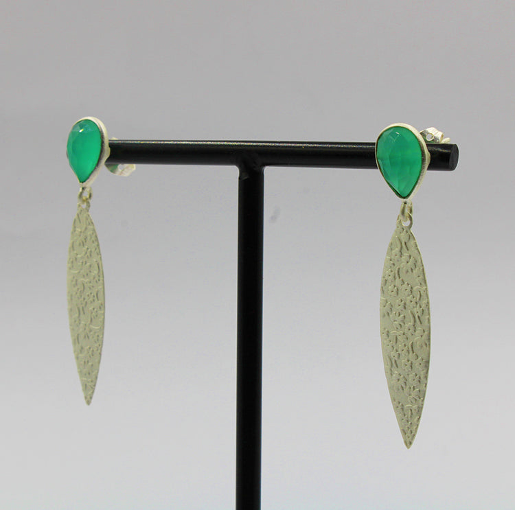 Discover vintage elegance with our finely designed earrings, plated in silver and adorned with a beautiful green onyx stone. Their vintage design makes them perfect for wearing both day and night, whether at informal meetings with friends or at business dinners. Light and comfortable, they are the ideal choice for a special gift. Elevate your style with these exquisite earrings that add a touch of sophistication to any occasion. Crafted in brass and plated in silver, these handmade earrings are a unique work of art.
